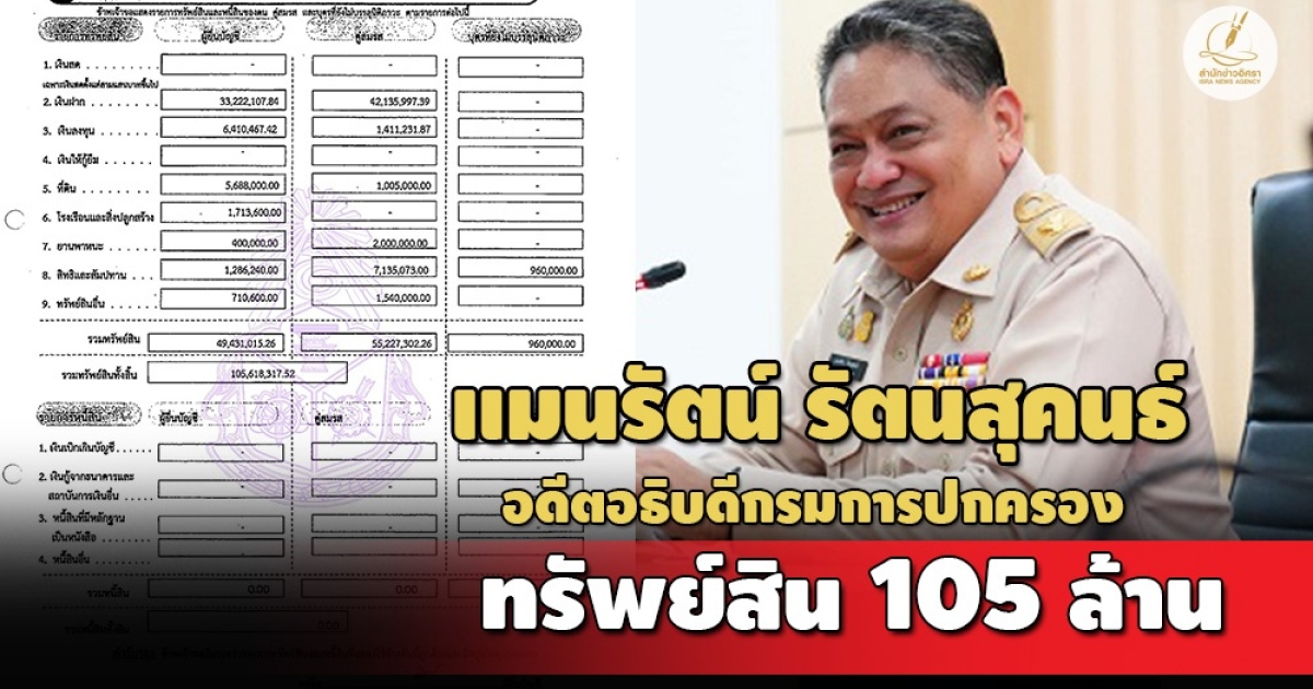 ป.ป.ช. เปิดบัญชีทรัพย์สิน 'แมนรัตน์ รัตนสุคนธ์' อดีตอธิบดีกรมการปกครอง มีทรัพย์สินกว่า 105 ล. เงินฝากรวม 75 ล. สะสมอาวุธปืน-นาฬิกา-พระเครื่อง รายได้ 2.6 ล./ปี