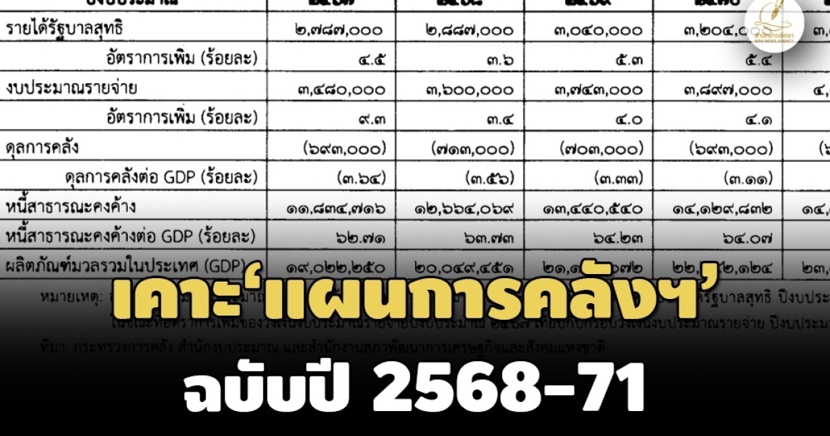 2.3 จากประมาณการรายได้รัฐบาลสุทธิและงบประมาณรายจ่ายดังกล่าวในปีงบประมาณ 2568-2571 รัฐบาลจะขาดดุลงบประมาณจำนวน 713,000 703,000 693,000 และ 683,000 ล้านบาท หรือร้อยละ 3.56 3.33 3.11 และ 2.92 ต่อ GDP ตามลำดับ