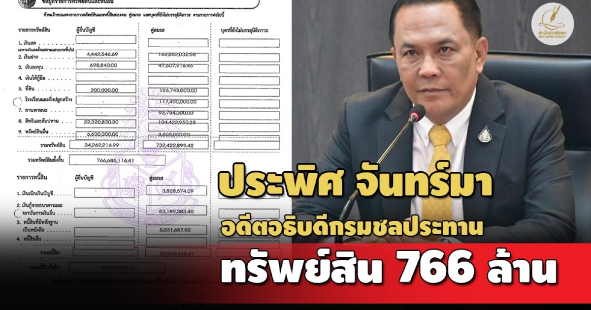 ป.ป.ช.เปิดทรัพย์สิน ‘ประพิศ จันทร์มา’ อดีตอธิบดีกรมชลประทาน พร้อมภรรยา 2 คน มีทรัพย์สินกว่า 766 ล. เงินฝากรวมกัน 174 ล. ที่ดิน 32 แปลง 196 ล. ส่วนใหญ่อยู่สงขลา รถ 56 คัน 92 ล.