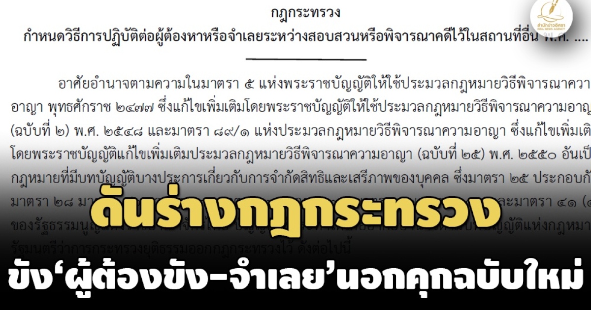‘ก.ยุติธรรม’ ดันร่างกฎกระทรวงฯ ขัง ‘ผู้ต้องหา-จำเลยระหว่างสอบสวน’ นอกคุก ลดเงื่อนไขบางประการที่เคร่งครัดมากจนเกินไป เพื่อให้ปฏิบัติได้ หลังเกิดภาวะนักโทษล้นเรือนจำ