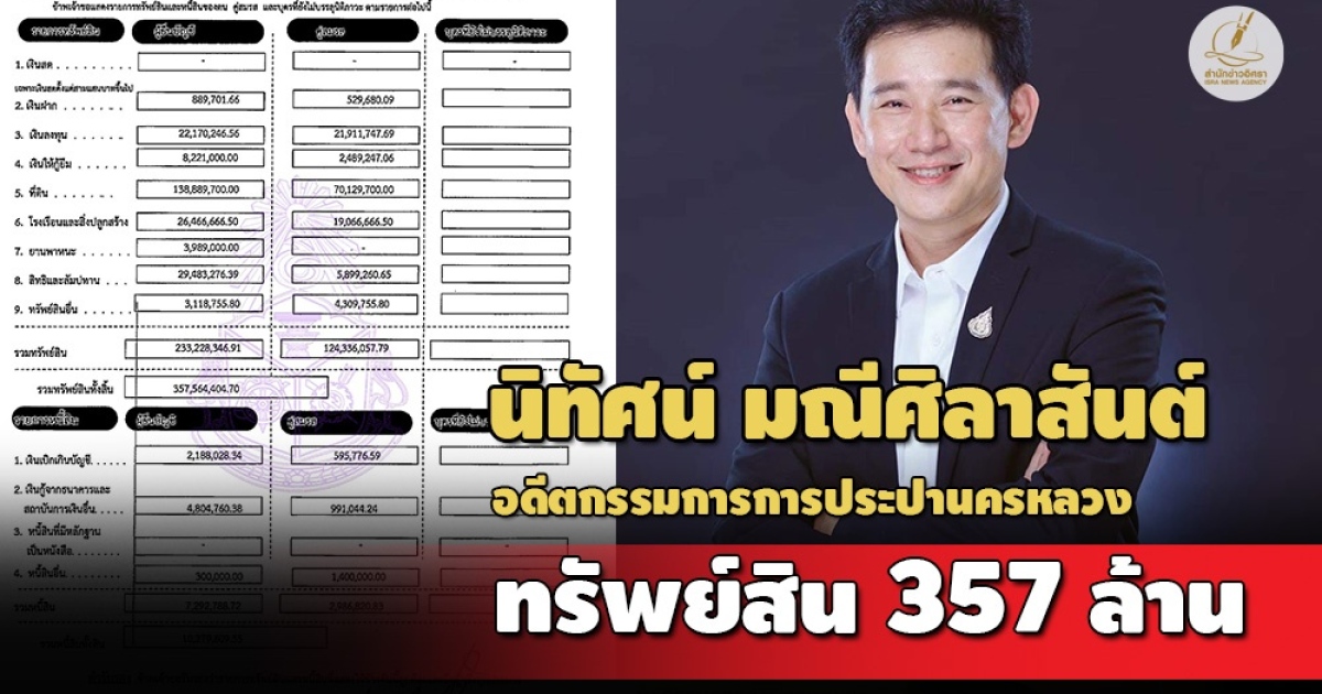 ป.ป.ช. เปิดทรัพย์สิน 'นิทัศน์ มณีศิลาสันต์' กรณีพ้น กรรมการการประปานครหลวง มีทรัพย์สินกว่า 357 ล. เงินให้กู้ยืม 8 ล. ที่ดิน 19 แปลง มูลค่า 138 ล. สะสมสร้อยทอง-อาวุธปืน รายได้ 7.4 ล./ปี