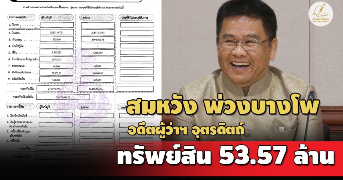 โดย นายสมหวัง พร้อมด้วย นางวันทนา พ่วงบางโพ คู่สมรส แจ้งมีทรัพย์สินทั้งสิ้น 53,578,084 บาท ไร้หนี้สิน