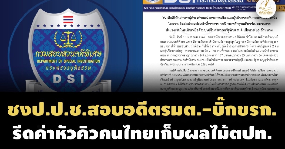 DSI ชง ป.ป.ช. สอบ 2 อดีตรัฐมนตรี-2 ข้าราชการระดับสูง เกี่ยวข้องค้ามนุษย์ เรียกเก็บเงินค่าหัวคิวแรงงานไทยเก็บผลไม้ฟินแลนด์คนละ 3,000 บ.