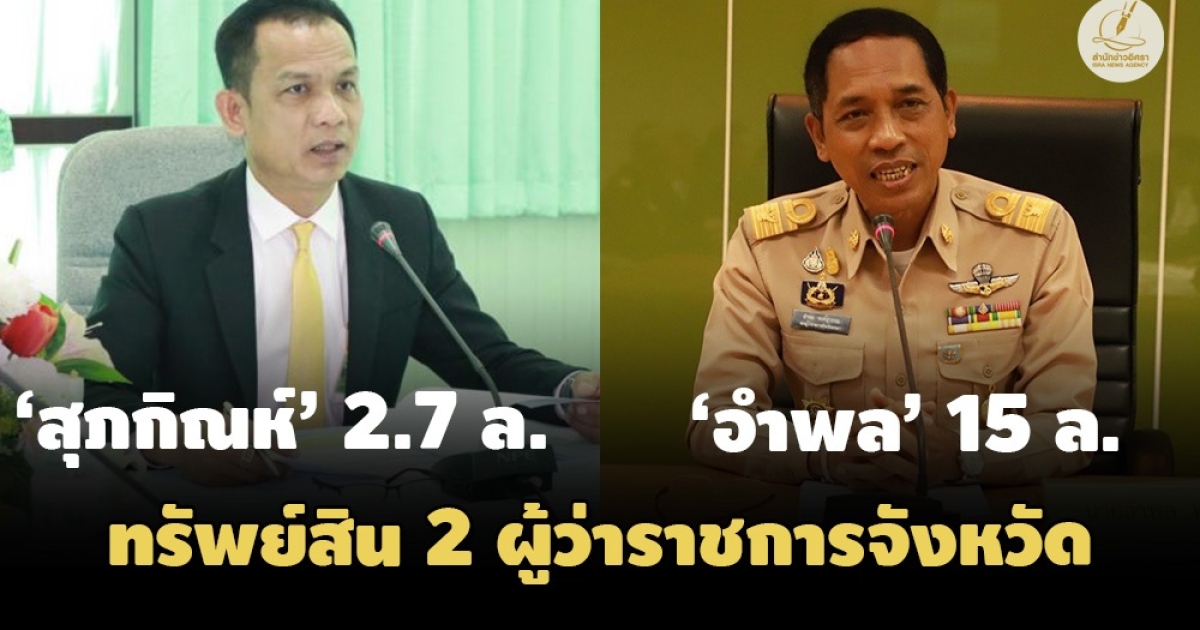 ป.ป.ช.เปิดทรัพย์สิน 2 ผู้ว่าราชการจังหวัด 'อำพล พงศ์สุวรรณ' ยะลา 15 ล้าน ที่ดิน 2 แปลง มีปืนสั้น-พระเครื่องพร้อมกรอบ-สร้อยคอ รายได้ 1.4 ล./ปี 'สุภกิณห์ แวงชิน' นครนายก 2.7 ล้าน ที่ดิน 2 แปลง มีแหวนเพชร-สร้อยคอทองคำ รายได้ 1.2 ล./ปี