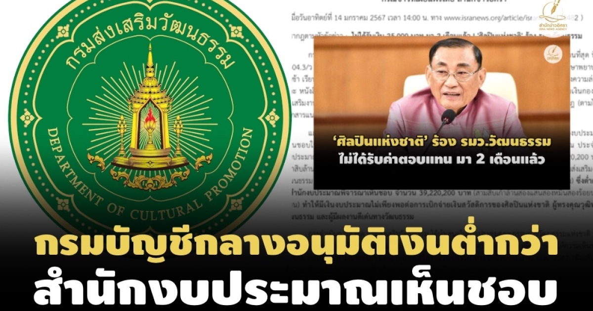 กรมส่งเสริมวัฒนธรรม ชี้แจงกับอิศราแล้ว! ปม ศิลปินแห่งชาติไม่ได้รับค่าตอบแทน 2 เดือน ระบุกรมบัญชีกลางอนุมัติรายจ่ายกองทุนส่งเสริมงานวัฒนธรรม ต่ำกว่าที่สำนักงบฯพิจารณาเห็นชอบไว้ ทำให้มีเงินไม่เพียงพอต่อการเบิกจ่ายเงินสวัสดิการศิลปินแห่งชาติ พร้อมแจ้งกรณีอธิบดีเดินทางไป ตปท.-ตจว.