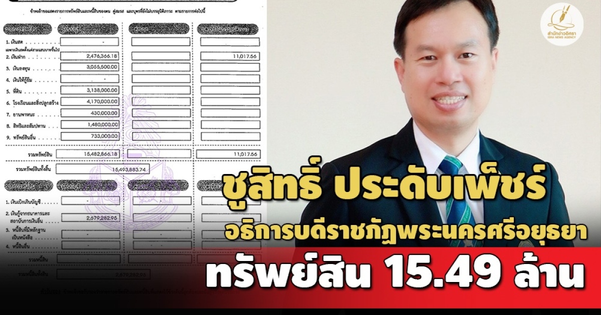 ป.ป.ช.เปิดทรัพย์สิน 'ชูสิทธิ์ ประดับเพ็ชร์' อธิการบดีมหาวิทยาลัยราชภัฏพระนครศรีอยุธยา มีทรัพย์สินกว่า 15.49 ล้าน ที่ดิน 3 แปลง รถจักรยานยนต์ 2 คัน สะสมพระเครื่อง-แหวนพระ-สร้อยคอทองคำ รายได้ 1.9 ล้าน./ปี