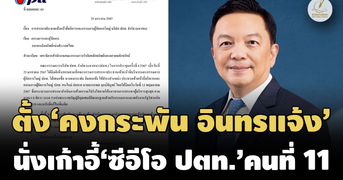 วันเดียวกัน บมจ.ปตท. แจ้งตลาดหลักทรัพย์ เรื่อง การสรรหาประธานเจ้าหน้าที่บริหารและกรรมการผู้จัดการใหญ่ บมจ.ปตท. โดยมีเนื้อหาว่า คณะกรรมการ บมจ.ปตท. ในการประชุมครั้งที่ 1/2567 เมื่อวันที่ 25 ม.ค.2567 ได้มีมติเห็นชอบตามที่คณะกรรมการสรรหาประธานเจ้าหน้าที่บริหารและกรรมการผู้จัดการใหญ่ ปตท. ได้เสนอชื่อนายคงกระพัน อินทรแจ้ง ให้ดำรงตำแหน่งประธานเจ้าหน้าที่บริหารและกรรมการผู้จัดการใหญ่ ปตท.คนใหม่ ต่อจากนายอรรถพล ฤกษ์พิบูลย์โดยให้มีผลในวันที่ 13 พ.ค.2567