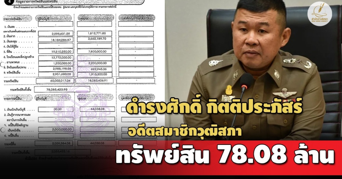 ป.ป.ช.เปิดทรัพย์สิน 'พล.ต.อ.ดำรงศักดิ์ กิตติประภัสร์' กรณีพ้นสมาชิกวุฒิสภา มีทรัพย์สินกว่า 78 ล. เงินลงทุน 18 ล. ที่ดิน 6 แปลง สะสมอาวุธปืน-สร้อยคอทองคำ รายได้ 2.8 ล./ปี