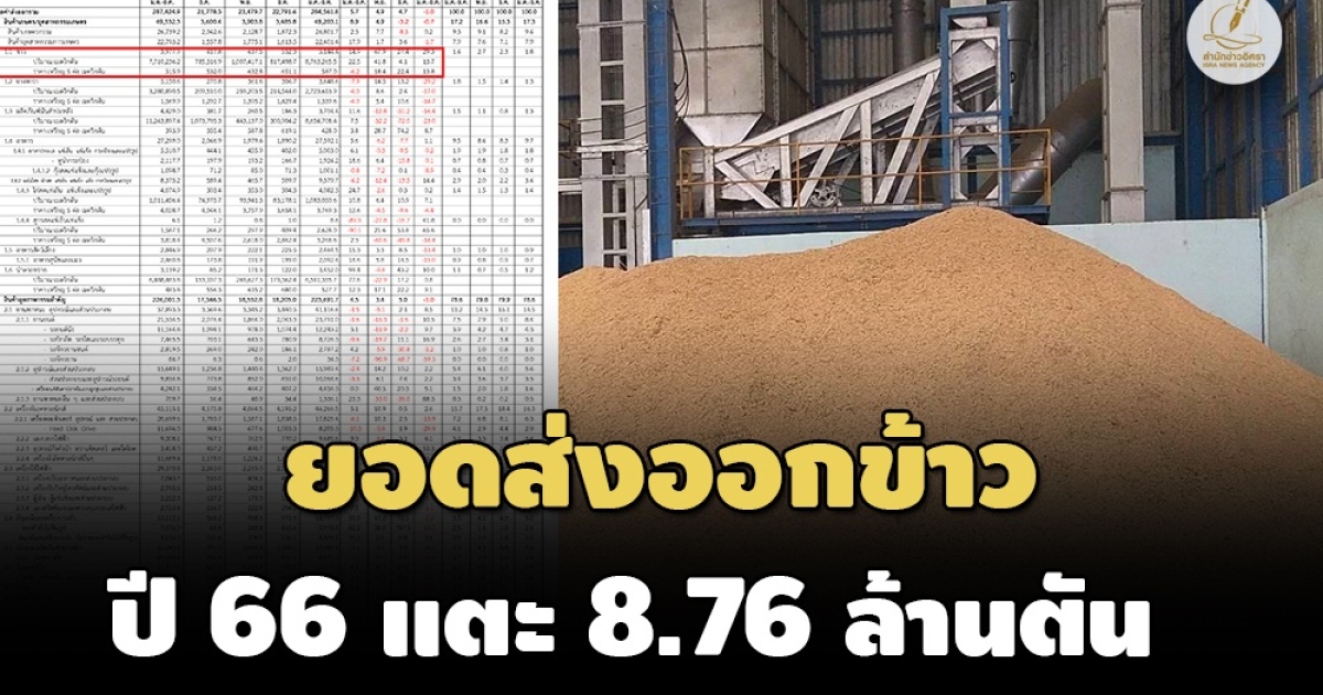 ‘พาณิชย์’ เผยปี 2566 ไทยส่งออกข้าวได้ 8.76 ล้านตัน เพิ่มขึ้น 13.7% เทียบกับปี 2565 สร้างรายได้เข้าประเทศ 1.78 แสนล้าน ขณะที่ราคาเฉลี่ยอยู่ที่ 587 ดอลลาร์สหรัฐ/ตัน เพิ่มขึ้น 13.8% จากปีก่อน