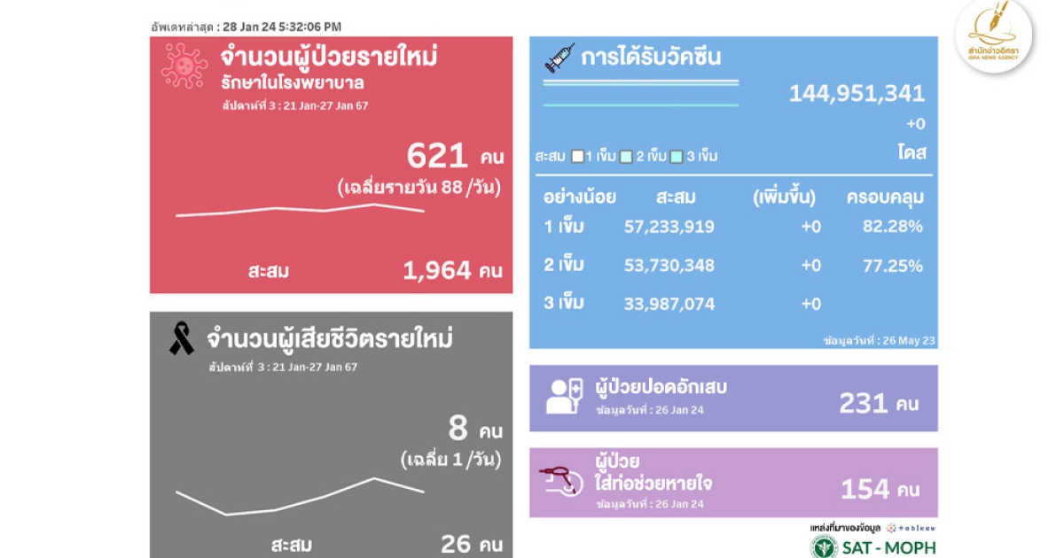 สถานการณ์โควิดไทย สัปดาห์ล่าสุด 21 - 27 มกราคม 2567 ติดเชื้อเข้ารักษาใน รพ.ใหม่ 621 ราย เฉลี่ย 88/วัน เสียชีวิต 8 ราย อาการหนัก 231 ราย