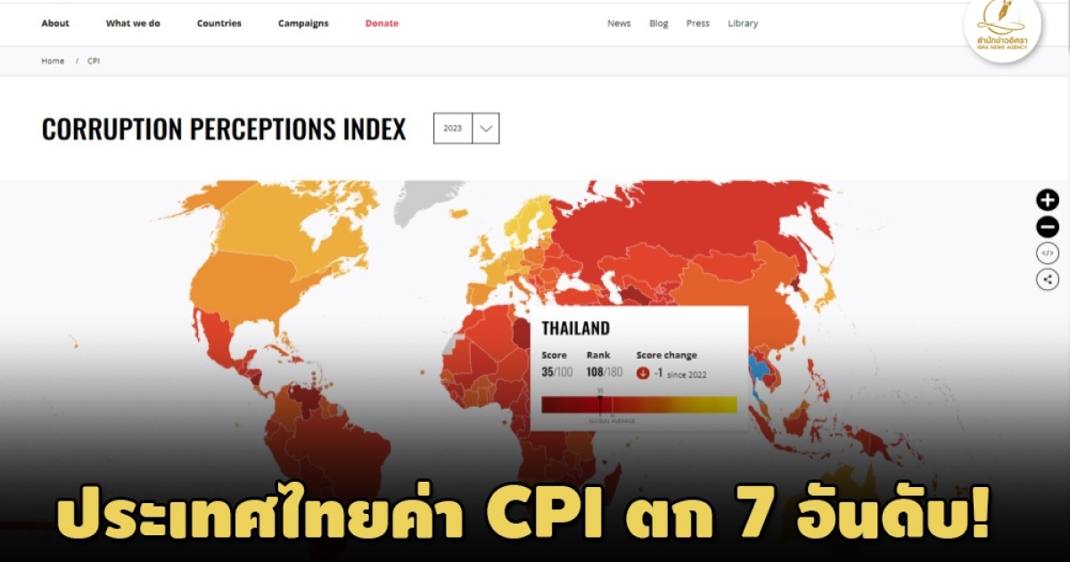 สำนักข่าวอิศรา (www.isranews.org) รายงานว่า เมื่อวันที่ 30 ม.ค.2567 เวลา 13.01 น. ตามเวลาในประเทศไทย องค์กรเพื่อความโปร่งใสนานาชาติ (Transparency International หรือ TI) ได้เผยแพร่ผลการสำรวจดัชนีการรับรู้การทุจริต (Corruption Perceptions Index หรือ CPI) ประจำปี 2566 โดยจากจำนวนประเทศ 180 ประเทศทั่วโลกนั้น ประเทศไทย ได้ 35 คะแนน คะแนนตกลงจากเมื่อปีที่แล้วที่ได้ 36 คะแนน จัดอยู่ในอันดับที่ 108 ของโลก ซึ่งอันดับตกลงจากปีก่อนที่ได้อันดับ 101 และคะแนน 35 คะแนนดังกล่าวเทียบเท่ากับที่ไทยเคยได้คะแนนต่ำสุดเมื่อปี 2556 และปี 2559