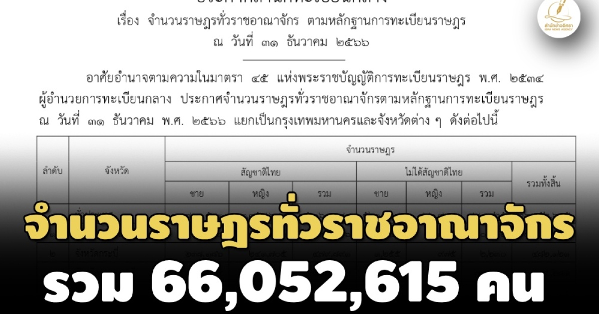 สำนักข่าวอิศรา (www.isranews.org) รายงานว่า เมื่อวันที่ 31 ม.ค. 2567 ราชกิจจานุเบกษาเผยแพร่ ประกาศสำนักทะเบียนกลาง เรื่อง จำนวนราษฎรทั่วราชอาณาจักร ตามหลักฐานการทะเบียนราษฎร ณ วันที่ 31 ธันวาคม 2566