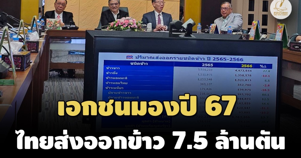 สมาคมผู้ส่งออกข้าวฯ คาดปี 67 ไทยส่งออกข้าวได้ 7.5 ล้านตัน ลดลงจากปีก่อนที่ส่งออกได้ 8.76 ล้านตัน เหตุ ‘คู่แข่ง’ มีแนวโน้มส่งออกข้าวเพิ่ม ขณะที่ ‘ผู้ซื้อ’ ลดนำเข้า โอดปัญหาใน ‘ทะเลแดง’ ดันค่าระวางเรือพุ่ง 4 เท่าในช่วงที่ผ่านมา