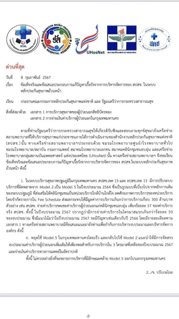 จึงเรียกร้องให้หยุดใช้ โมเดล 5 ในกทม.โดยเร็ว และกลับไปใช้โมเดล 2 และแนะนำให้จัดสรรงบประมาณค่าบริการผู้ป่วยนอกเพิ่มเติมให้เพียงพอสำหรับการบริการใน 3 ไตรมาส ที่เหลือของปีงบประมาณ 2567 และจ่ายเงินค่าบริการทางการแพทย์ในอัตราปกติ และไม่ควรขยายบริการโมเดล 5 ออกไปนอก กทม.