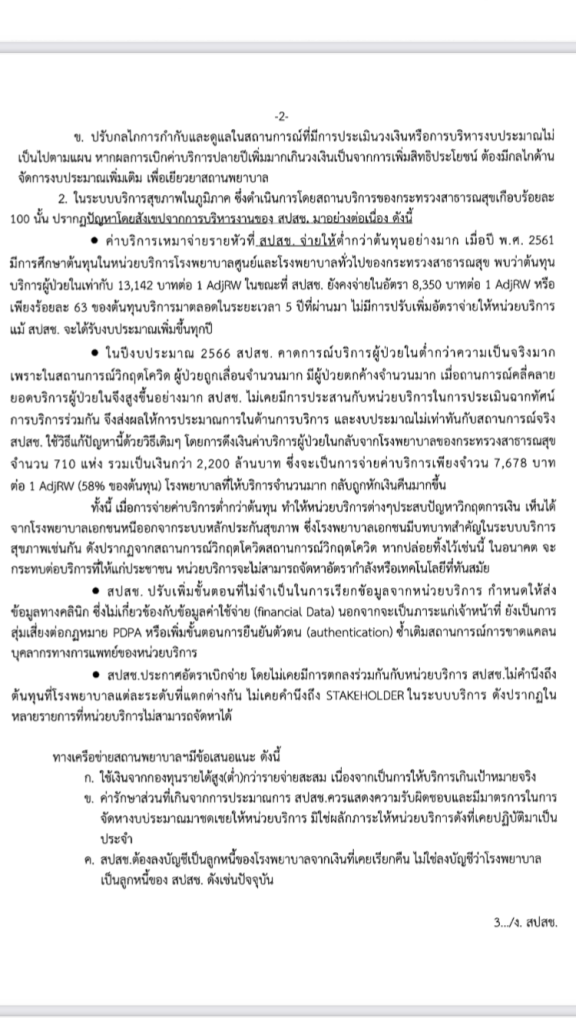 และ 2.คลินิกชุมชนอบอุ่นที่ใช้รูปแบบการจ่ายแบบโมเดล 5 หรือจ่ายตามรายการจ่ายจริง (Fee Schedule) ก็เรียกร้องว่าน่าจะกลับไปใช้วิธีการจ่ายแบบโมเดล 2 เหมือนเดิม คือการเหมาจ่าย ตามจำนวนผู้ใช้บริการในเขตที่รับผิดชอบ ที่ทำให้คลินิกชุมชนอบอุ่นดูแลทั้งการส่งเสริมป้องกัน รักษาพยาบาล และฟื้นฟูสภาพ