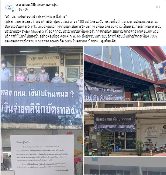 ผู้สื่อข่าวรายงานว่า เมื่อวันที่ 7 ก.พ.ที่ผ่านา เครือข่ายคลินิกชุมชนอบอุ่นในกทม. กว่า 100 แห่ง ขึ้นป้ายดำประท้วงกรณีการเบิกจ่ายงบประมาณของ สปสช. ส่งผลให้ขาดสภาพคล่องกันทั่วหน้า เครือข่ายแพทย์ 4 สถาบัน ประกอบด้วย เครือข่ายโรงพยาบาลกลุ่มสถาบันแพทยศาสตร์แห่งประเทศไทย, ชมรมโรงพยาบาลศูนย์/โรงพยาบาลทั่วไป, ชมรมโรงพยาบาลสถาบันกรมการแพทย์ และ สมาคมคลินิกชุมชนอบอุ่น ได้ยื่นจดหมายเปิดผนึกถึง นพ.ชลน่าน ศรีแก้ว รัฐมนตรีว่าการกระทรวงสาธารณสุข ในฐานะประธานคณะกรรมการหลักประกันสุขภาพแห่งชาติ เรื่องข้อเท็จจริงและข้อเสนอประกอบการแก้ปัญหาเรื้อรังจากการบริหารจัดการของ สปสช. ในระบบหลักประกันสุขภาพถ้วนหน้า
