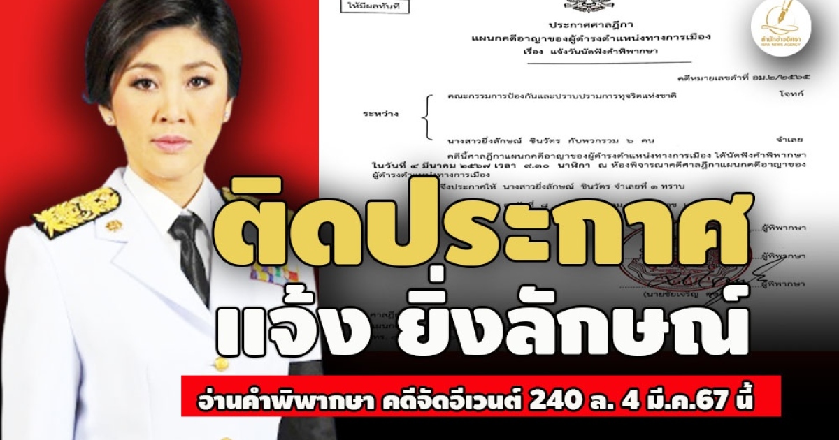 ชี้ชะตา 'คดีฮั้วสื่อจัดโรดโชว์ สร้างอนาคตไทย 240 ล้าน' ศาลฎีกาแผนกคดีอาญาผู้ดำรงตำแหน่งทางการเมือง นัดอ่านคำพิพากษา 4 มี.ค.2567 นี้ เผยมีติดประกาศแจ้งให้ 'ยิ่งลักษณ์' จำเลยที่ 1 รับทราบเป็นทางการไปแล้ว