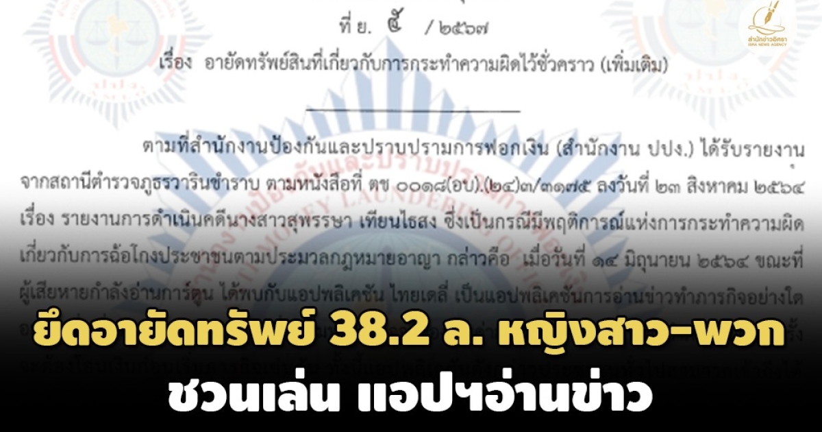 ปปง.สั่งยึดอายัดทรัพย์สิน 2 ครั้ง 91 รายการ 38.2 ล้าน คดี ‘สุพรรษา เทียนไธสง’พวก แอปฯไทยเดลี ชักชวนอ่านข่าวรับเงินรางวัล ต้องจ่ายค่าสมัครก่อน ผู้เสียหายเชื่อโอนตังค์ สุดท้ายถูกหลอก แจ้งความ สภ.วารินชำราบ พบแบ่งหน้าที่กันทำ หาสมาชิก เปิดบัญชี คนรับเงินเบื้องหลัง ศาลจังหวัดอุบลฯพิพากษาแล้วมีความผิด