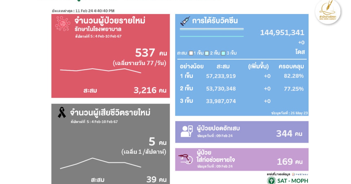 สถานการณ์โควิดไทย สัปดาห์ล่าสุด 4 - 10 ก.พ. 2567 ติดเชื้อเข้ารักษาใน รพ.ใหม่ 537 ราย เฉลี่ย 77/วัน เสียชีวิต 5ราย อาการหนัก 344 ราย
