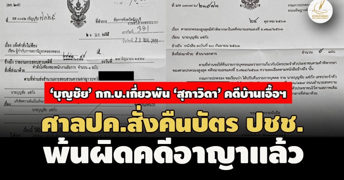‘บุญชัย’ กก.บริษัทเกี่ยวพัน ‘สุภาวิดา’ คดีบ้านเอื้ออาทรแจงศาลปกครองสูงสุดสั่งคืนชื่อทะเบียนราษฎร-บัตรประชาชน อัยการไม่ฟ้องคดีอาญาข้อหาร่วมมือ จนท.-แจ้งความเท็จ ไม่ผิดตาม พ.ร.บ.ประกอบธุรกิจของคนต่างด้าวหลังดีเอสไอกล่าวโทษก่อนหน้าแล้ว