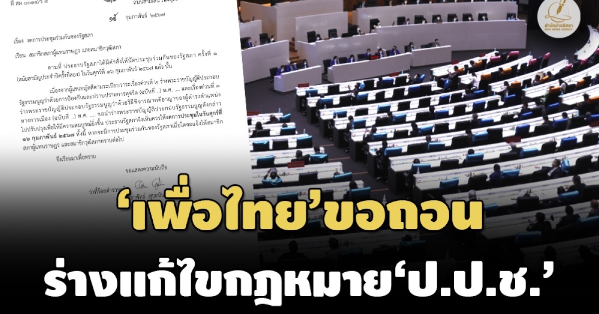 ‘ประธานรัฐสภา’ สั่งงดประชุมร่วมรัฐสภา 16 ก.พ.นี้ หลัง ‘เพื่อไทย’ ขอถอนร่างกฎหมาย ‘ป.ป.ช.’-ร่าง พ.ร.บ.วิธีพิจารณาคดีอาญาผู้ดำรงตำแหน่งทางการเมือง 'ชูศักดิ์' แจงเหตุถอนร่างฯ นำไปทบทวน หลัง 'ป.ป.ช.' ทักท้วงอาจขัดรัฐธรรมนูญ