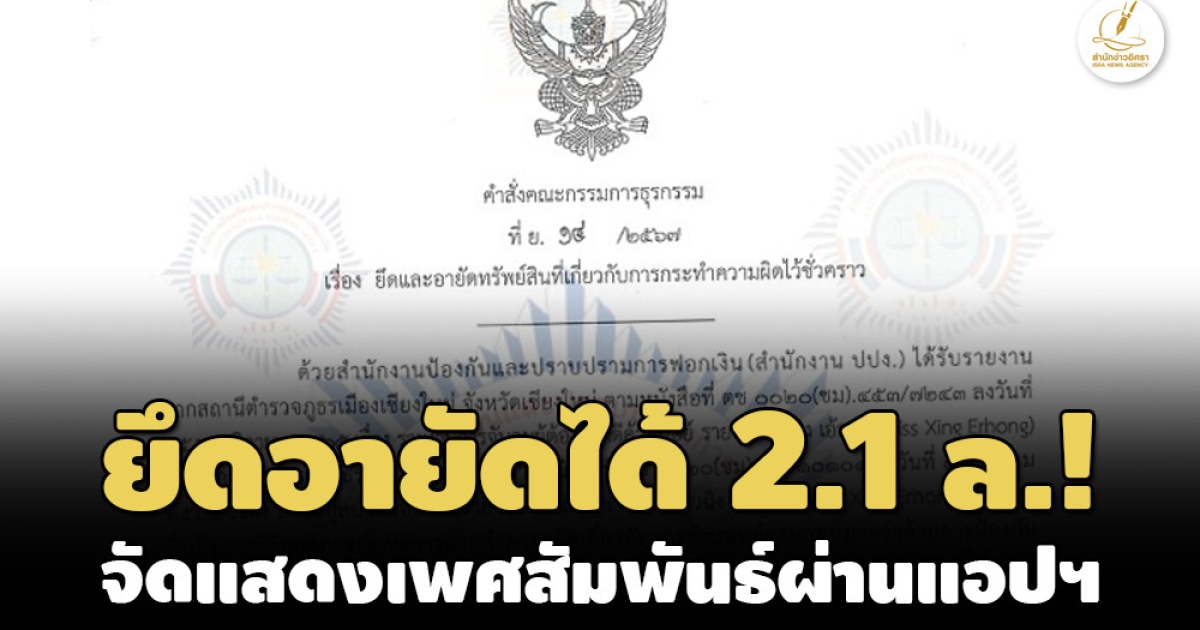 ปปง.ยึดอายัดทรัพย์ได้ 2.1 ล. คดีกลุ่มทุนหญิงสาวชาวจีน ‘ฉิง เอ้อ หง’ พวก ค้ามนุษย์ จัดแสดงหญิงชายมีเพศสัมพันธ์ถ่ายทอดสดผ่านแอปฯเก็บค่าเข้าชม เหตุเกิดที่บ้าน จ.เชียงใหม่ หลังตำรวจบุกจับ 19 คน ขยายผล