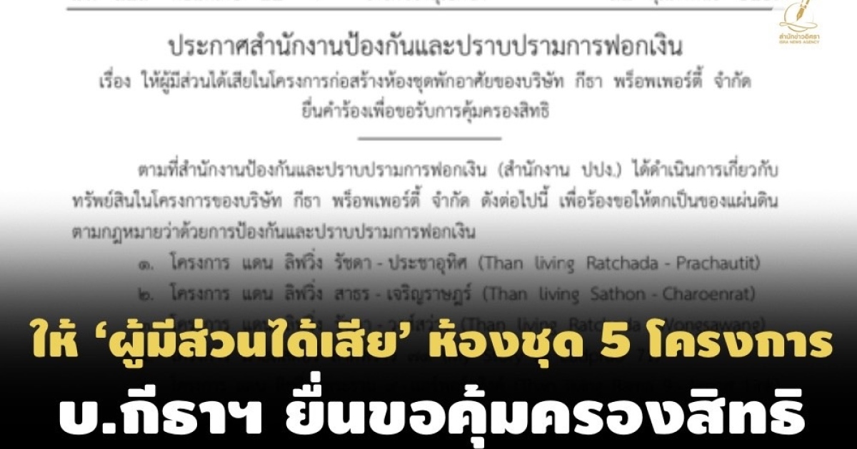 สำนักข่าวอิศรา (www.isranews.org) รายงานว่า ราชกิจจานุเบกษา วันที่ 15 ก.พ.2567 เผยแพร่ ประกาศสำนักงานป้องกันและปราบปรามการฟอกเงิน เรื่องให้ผู้มีส่วนได้เสียในโครงการก่อสร้างห้องชุดพักอาศัยของบริษัท กีธา พร็อพเพอร์ตี้ จำกัด ยื่นคำร้องเพื่อขอรับการคุ้มครองสิทธิ ความว่า