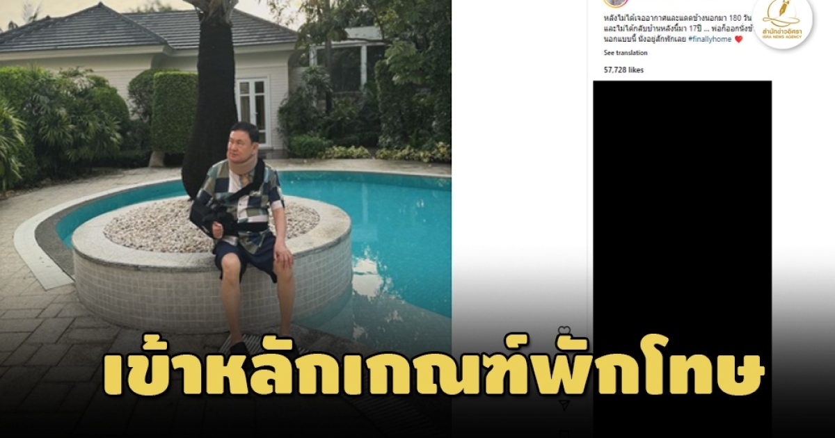 ล่าสุด น.ส.แพทองธาร ชินวัตร หัวหน้าพรรคเพื่อไทย บุตรสาวคนเล็กของนายทักษิณ ชินวัตร ได้โพสต์ภาพ ใน Instagram ส่วนตัว ขณะที่นายทักษิณ นั่งอยู่ริมสระว่ายน้ำ พร้อมข้อความระบุว่า หลังไม่ได้เจออากาศและแดดข้างนอกมา 180 วัน และไม่ได้กลับบ้านหลังนี้มา 17 ปี … พ่อก็ออกนั่งข้างนอกแบบนี้ นั่งอยู่สักพักเลย #finallyhome