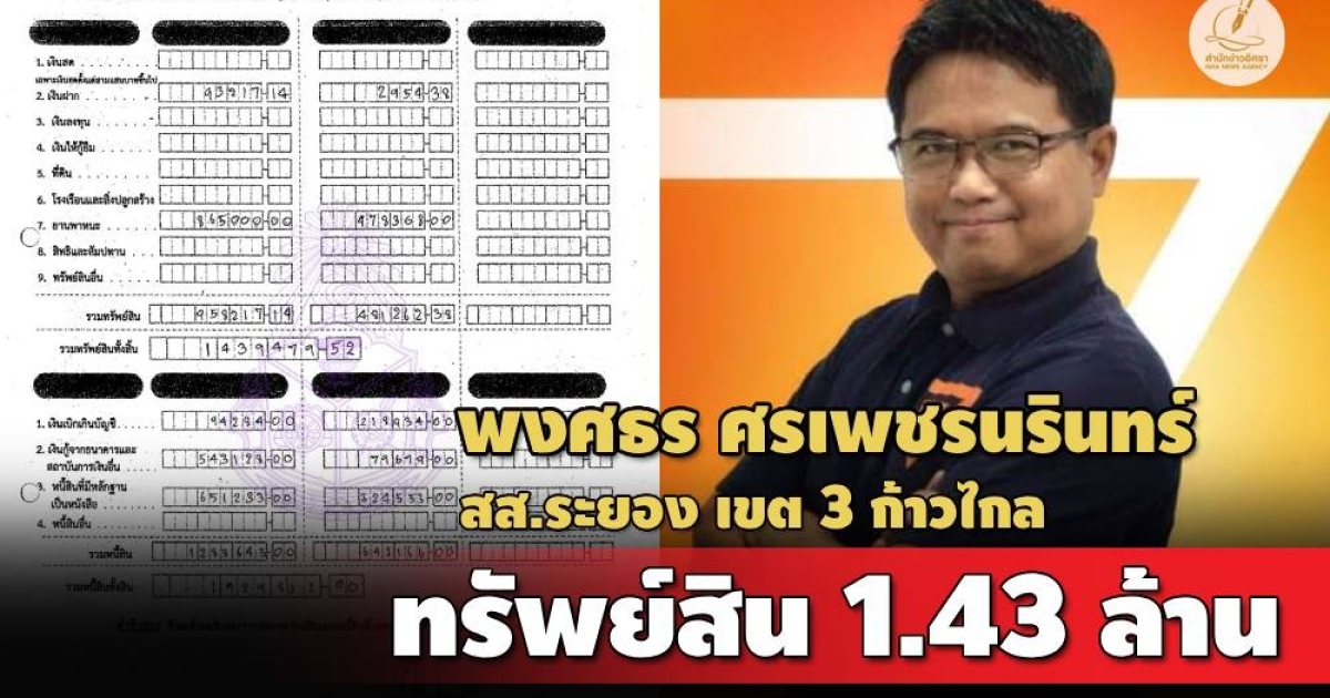 ป.ป.ช.เปิดทรัพย์สิน 'พงศธร ศรเพชรนรินทร์' สส.ระยอง เขต 3 พรรคก้าวไกล มีทรัพย์สินกว่า 1.4 ล้าน รถยนต์ 1 คัน หนี้สิน 1.9 ล้าน รายได้ 1.5 ล้าน/ปี