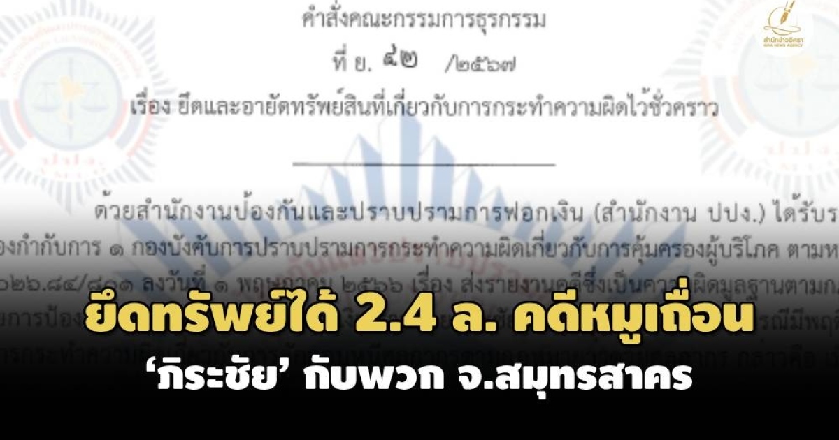 2.เงินในบัญชีเงินฝากธนาคารกสิกรไทย สาขาโลตัส มหาชัย 2 ถ.พระราม 2 ชื่อบัญชีนายภิระชัย หลงชิน ยอดเงินคงเหลือ 340,950.52 บาท พร้อมดอกผลไม่เกิน 90 วัน นับแต่วันที่ คณะกรรมการธุรกรรมมีมติ เมื่อวันที่ 13 ก.พ.-12 พ.ค.2567
