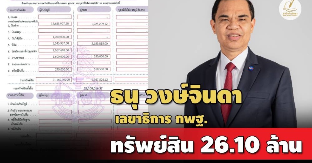 โดย ว่าที่ร้อยตรี ธนุ พร้อมด้วย นางอรภิญ วงษ์จินดา คู่สมรส แจ้งมีทรัพย์สินทั้งสิ้น 26,108,016 บาท ไร้หนี้สิน