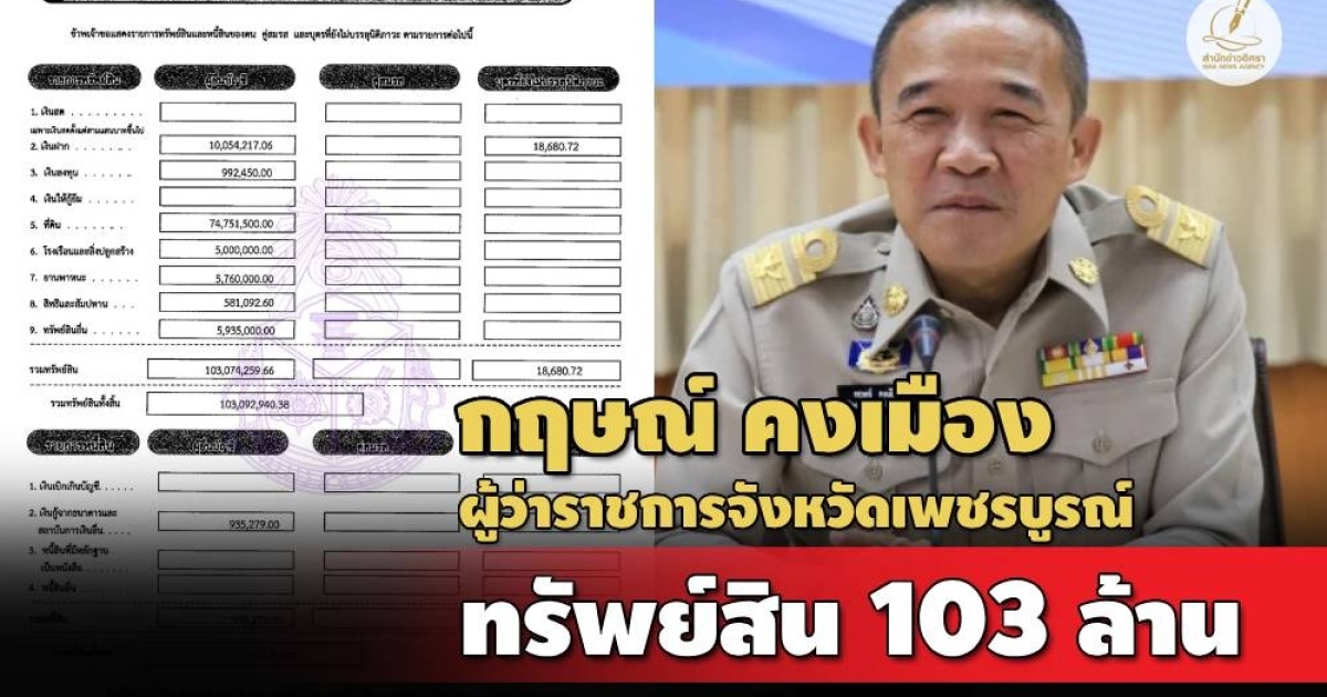 ป.ป.ช.เปิดทรัพย์สิน 'กฤษณ์ คงเมือง' ผู้ว่าราชการจังหวัดเพชรบูรณ์ มีทรัพย์สินกว่า 103 ล. เงินฝาก 10 ล. ที่ดิน 13 แปลง มูลค่า 74 ล. สะสมอาวุธปืน-นาฬิกาแบรนด์เนม รายได้ 1.3 ล./ปี