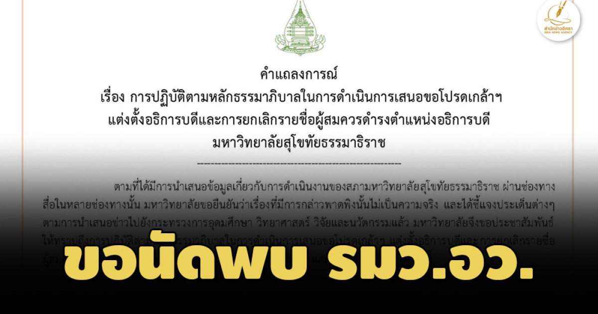 มสธ.แถลงการณ์ย้ำยึดหลักธรรมาภิบาล ปมถอนชื่อ 'วรรณธรรม'-ยกเลิกมติแต่งตั้งอธิการบดี พร้อมขอนัดพบ รมว.อว.เพื่อชี้แจงข้อมูล-หลักฐาน