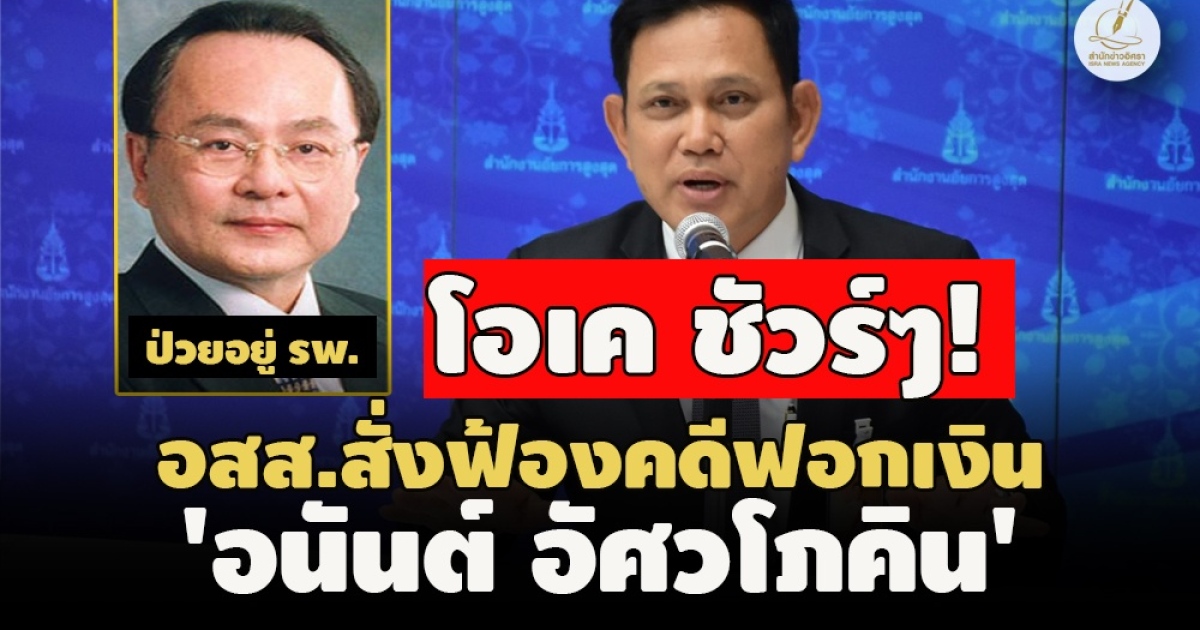'ประยุทธ เพชรคุณ' โฆษกสำนักงานอัยการสูงสุด คอนเฟิร์ม อสส.สั่งฟ้อง 'อนันต์ อัศวโภคิน' คดีฟอกเงินซื้อที่สหกรณ์เครดิตยูเนี่ยนคลองจั่นแล้ว เตรียมจัดทำเอกสารเผยแพร่คำชี้แจงต่อสื่อมวลชน ขณะที่ตัวแทนนักธุรกิจชื่อดัง แจงยังไม่ทราบเรื่อง - เจ้าตัวป่วยอยู่โรงพยาบาล