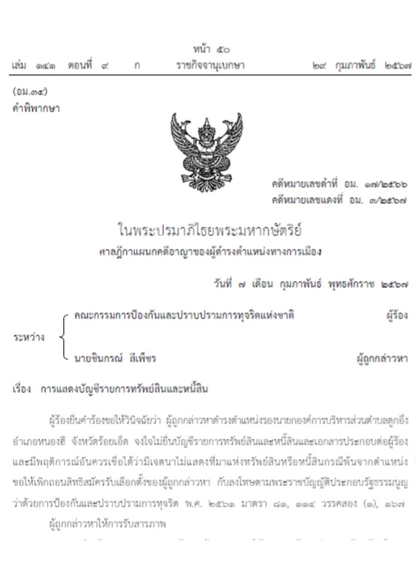 สำนักข่าวอิศรา (www.isranews.org) รายงานว่า วันที่ 29 ก.พ.2567 ราชกิจจานุเบกษาได้เผยแพร่ คำพิพากษา ศาลฎีกาแผนกคดีอาญาของผู้ดำรงตำแหน่งทางการเมือง คดีหมายเลขดำที่ อม.17/2566 คดีหมายเลขแดงที่ อม.3 /2567 วันที่ 7 ก.พ.2567 ระหว่าง คณะกรรมการป้องกันและปราบปรามการทุจริตแห่งชาติ ผู้ร้อง นายชินกรณ์ สีเพ็ชร ผู้ถูกกล่าวหา เรื่อง การแสดงบัญชีรายการทรัพย์สินและหนี้สิน
