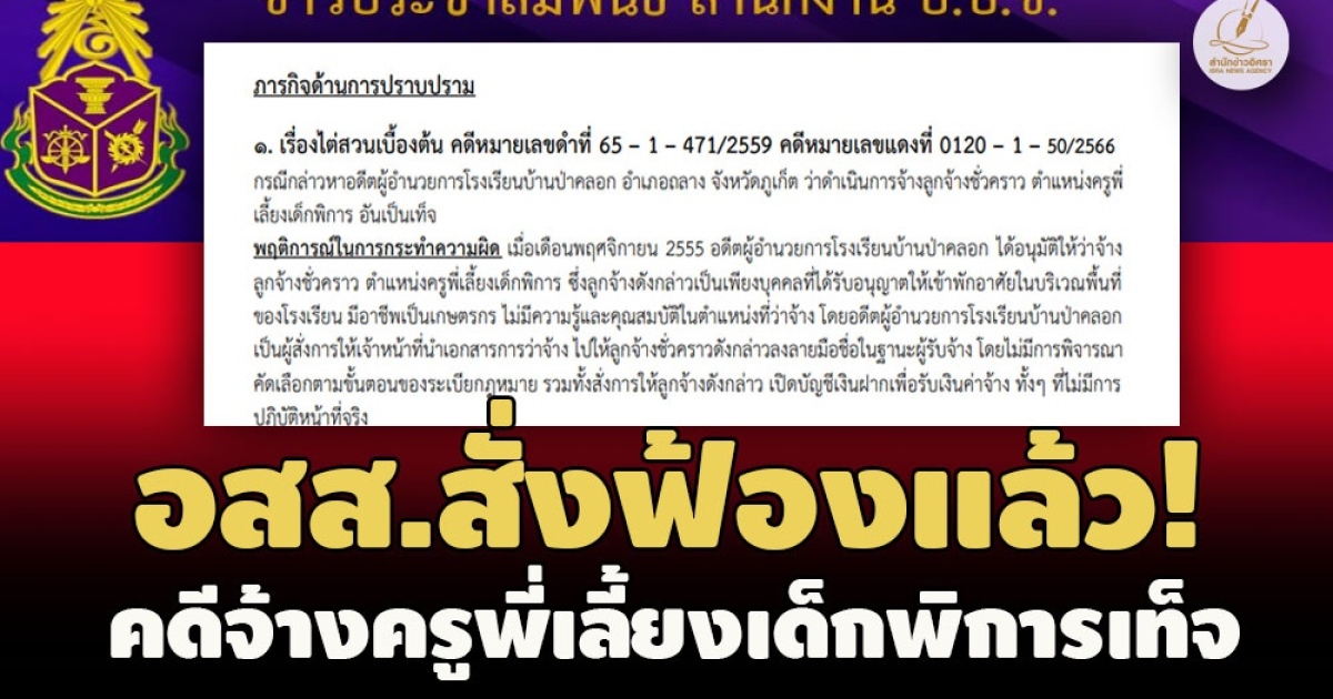 ป.ป.ช.ภูเก็ต เผยความคืบหน้าผลคดีกล่าวหา อดีต ผอ.โรงเรียนบ้านป่าคลอก อำเภอถลาง ภูเก็ต จ้างครูพี่เลี้ยงเด็กพิการเป็นเท็จ ล่าสุด อสส. มีความเห็นสั่งฟ้องผู้ถูกกล่าวหาแล้ว ชี้พฤติการณ์ผู้สั่งการ เอาเกษตรกร ไม่มีความรู้คุณสมบัติมารับจ้าง เปิดบัญชีเงินฝากเพื่อรับเงินค่าจ้าง ทั้งๆ ที่ไม่มีการปฏิบัติหน้าที่จริง