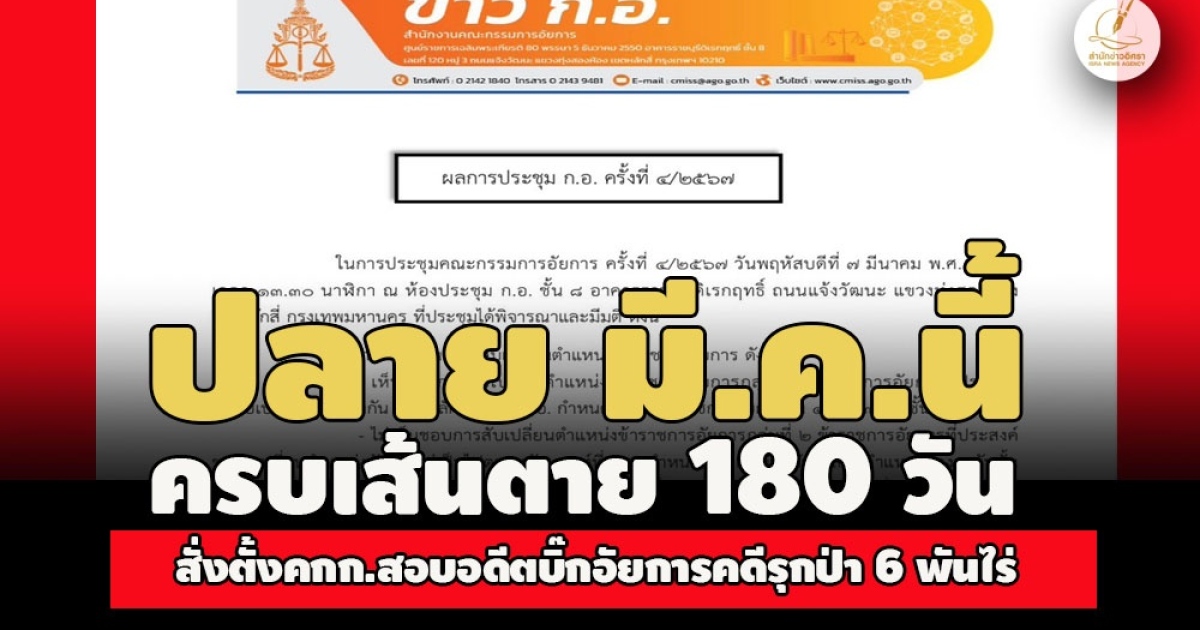 ก.อ.ถกปมอดีตบิ๊กอัยการคดีรุกป่า 6 พันไร่ ยังจบไม่ลง! ติดปัญหาระเบียบข้อกฎหมายยังไม่ครอบคลุม หารือต่อ 20 มี.ค.นี้ เผยเจ้าตัวลาออกไปแล้วตั้งแต่ช่วงปลายเดือน ต.ค. เส้นตาย 180 วัน ไม่ตั้งคกก.สอบสวน ปลาย มี.ค.นี้ ส่อรอด