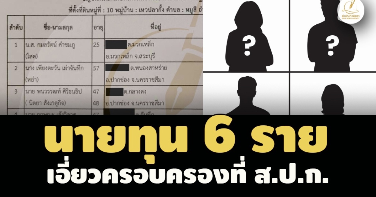 'อภิชาติ ศิริสุนทร' ปธ.กมธ.ที่ดินฯ เผยอิศรา ส่งเรื่องให้ป.ป.ช.สอบคุณสมบัติเกษตรกร 5 ราย ได้รับแจกที่ ส.ป.ก.โคราชแล้ว ระบุมีรายอื่นด้วย รวม 59 แปลง ได้ชื่อแล้ว -ด้าน 'ธนดล สุวัณณะฤทธิ์' ที่ปรึกษารมว.เกษตรฯ พาขรก.ไป ปปป.เข้าสอบสวนเพิ่ม มีเตรียมออกหมายเรียก 6 นายทุน ครอบครองที่ดินผิดกม.-ข้าราชการระดับสูงทำผิดด้วย 2-3 ราย