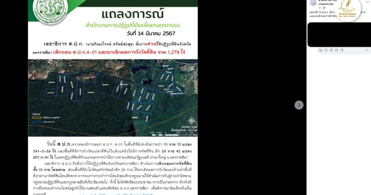เลขาฯ ส.ป.ก.สั่งปฏิรูปที่ดินโคราชยกเลิกรังวัดที่ดิน 1,279 ไร่ เผยพื้นที่ 10 รายตรวจสอบแล้วยังเป็นพื้นที่ป่า ส่วนอีก 26 รายยังไม่มีการจัดการที่ดิน