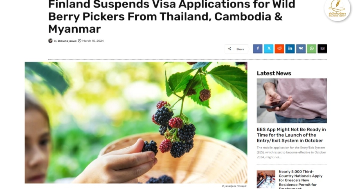 ฟินแลนด์เพิกถอนวีซ่าแรงงานไทยเก็บเบอร์รี่เป็นปีที่ 2 ต้นเหตุจากรายงานค้ามนุษย์ มีเหยื่อหลายร้อยคน ขณะกัมพูชา เมียนมาถูกเพิกถอนด้วยเพราะเป็นเขตอำนาจสถานทูตเดียวกัน