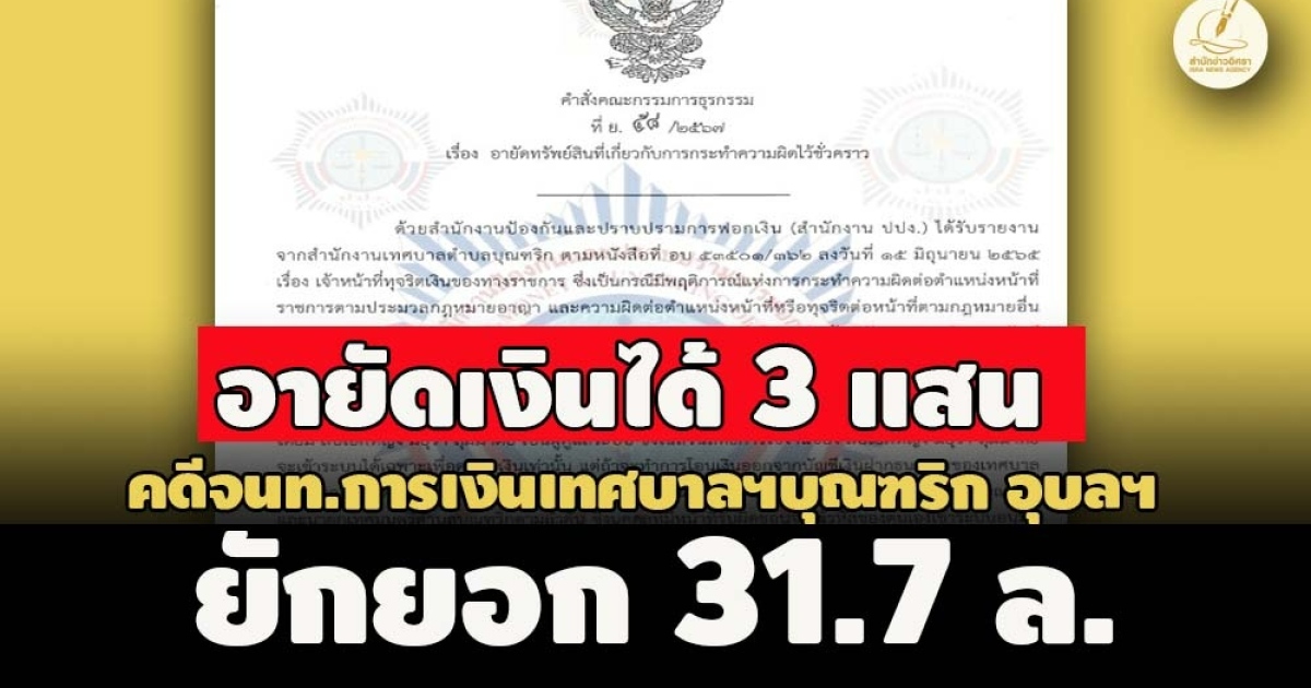 ปปง.ตามอายัดเงินฝากแบงก์ 11 รายการ 302,185 บ. เจ้าพนักงานการเงินฯ เทศบาลตำบลบุณฑริก ยักยอก 31.7 ล.โอนเข้าบัญชีตัวเอง ถูกหน่วยงานต้นสังกัดร้องทุกข์กล่าวโทษ ตร.ฐานทุจริต ฟอกเงิน ศาลอาญาคดีทุจริตฯภาค 3 สั่งจำคุก 70 ปี ให้ชดใช้ 31.65 ล.
