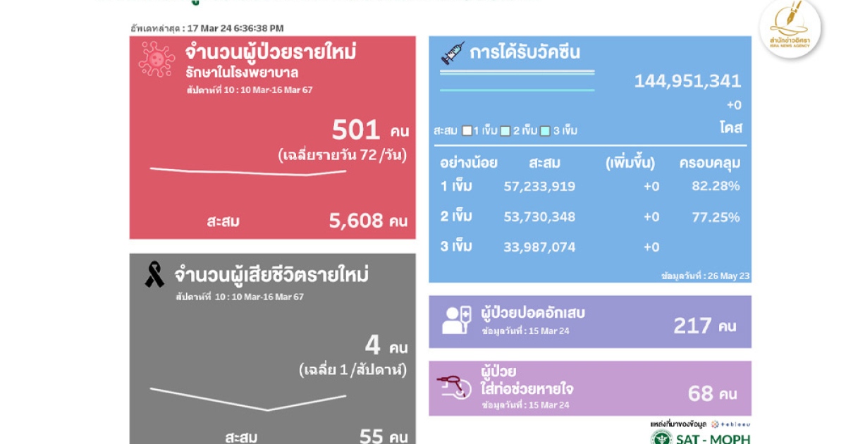 สำนักข่าวอิศรา (www.isranews.org) รายงานสถานการณ์แพร่ระบาดของโรคโควิด-19 ประเทศไทย ประจำสัปดาห์ ระหว่างวันที่ 10 - 16 มี.ค. 2567 มีจำนวนผู้ติดเชื้อใหม่เข้ารักษาตัวโรงพยาบาล 501 ราย เฉลี่ยวันละ 72 ราย ทำให้จำนวนผู้ติดเชื้อสะสมอยู่ที่ 5,608 ราย (ตั้งแต่ 1 ม.ค. 2567)