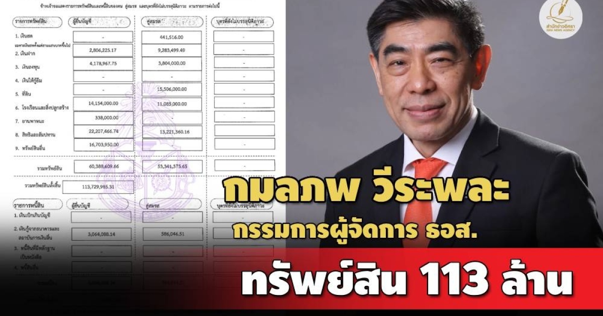 ป.ป.ช.เปิดทรัพย์สิน 'กมลภพ วีระพละ' กรรมการผู้จัดการ ธนาคารอาคารสงเคราะห์ มีทรัพย์สินกว่า 113 ล. เงินลงทุน 4.1 ล. สะสมแหวน-สร้อยคอ-นาฬิกา-พระเลี่ยมทอง รายได้ 4.2 ล./ปี