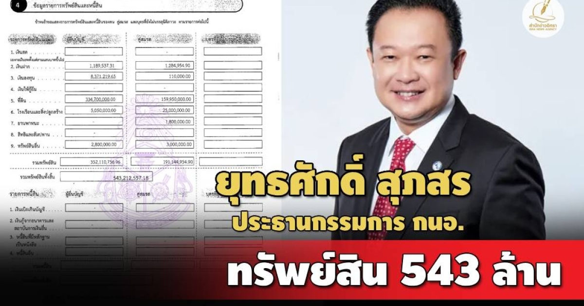 โดยนายยุทธศักดิ์ พร้อมด้วย นางศศลักษณ์ สุภสร คู่สมรส แจ้งมีทรัพย์สินทั้งสิ้น 543,212,557 บาท ไร้หนี้สิน