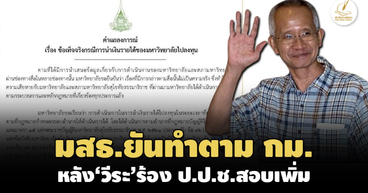 มสธ.แจงปมนำเงินรายได้ไปลงทุน บลจ. 5.5 พัน ล. ยันที่ผ่านมาทำถูกต้องตามกระบวนการและหลักกฎหมายที่เกี่ยวข้องทุกประการแล้ว หลัง 'วีระ' ร้อง ป.ป.ช.สอบ-จี้ รมว.อว.สอบการสรรหานายกสภาสภาฯหลังพบขาดคุณสมบัติ-มีลักษณะต้องห้าม