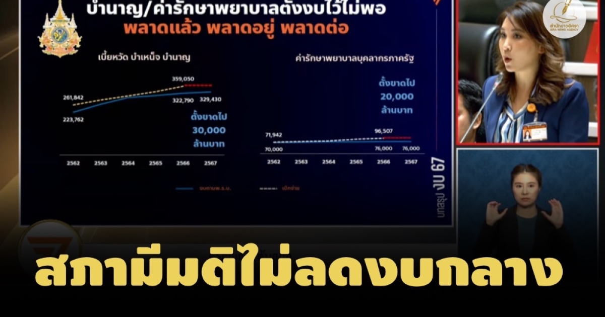 นางสาวศิริกัญญา ตันสกุล สส.บัญชีรายชื่อ พรรคก้าวไกล กล่าวว่า อยากให้รัฐบาลจัดสรรงบกลางให้ตรงตามวัตถุประสงค์ในการมีงบกลาง โดยปีนี้พบว่ารัฐบาลไม่ได้จัดสรรเบี้ยหวัด บำเหน็จ บำนาญข้าราชการ และค่ารักษาพยาบาลของบุคลากรภาครัฐไว้อย่างเพียงพอ ซึ่งถือว่าพลาดแล้ว พลาดอยู่ พลาดต่อ โดยปีนี้เป็นปีที่ 3 ที่ตั้งงบไว้ขาดเป็นจำนวนมาก ยกตัวอย่างเบี้ยหวัด บำเหน็จบำนาญของข้าราชการ ปี 2566 มีการเบิกจ่ายเกือบ 360,000 ล้านบาท แต่ปี 2567 ตั้งไว้ที่ 330,000 ล้านบาท ขาดงบประมาณไปประมาณ 30,000 ล้านบาท เป็นต้น เรื่องนี้ได้รับการยืนยันแล้วว่าเป็นความจริงในการตั้งงบประมาณขาด แต่จะขาดเท่าไรขึ้นอยู่กับการประมาณการ