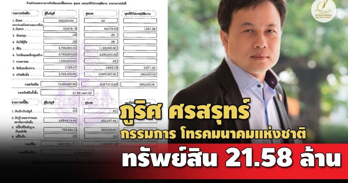 โดย นายภูริศ พร้อมด้วย นางสุวพร ศรสรุทร์ คู่สมรส และบุตรที่ยังไม่บรรลุนิติภาวะ แจ้งมีทรัพย์สินทั้งสิ้น 21,581,441 บาท หนี้สิน 8,759,208 บาท