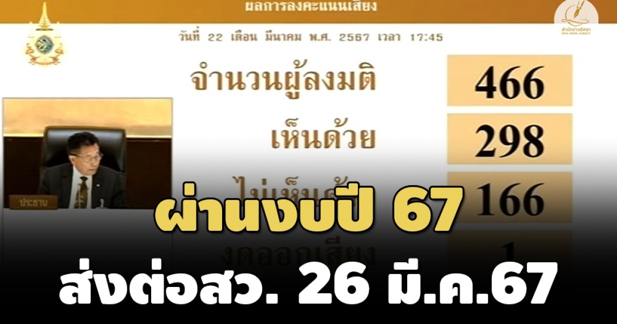 ที่ประชุมสส.โหวตผ่านงบประมาณปี 67 ด้วยคะแนน 298 ต่อ 166 เสียง ส่งต่อ สว.พิจารณา 26 มี.ค. 67นี้ ก่อนทูลเกล้าฯ และมีผลบังคับใช้ช่วงเดือน พ.ค. 67 ‘เศรษฐา’ ขอบคุณ ยืนยันจะนำข้อเสนอแนะไปปรับปรุง