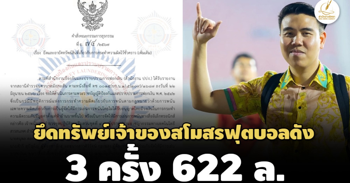 ปปง.ยึดอายัดทรัพย์ลอต 3 ‘บอสตาล-พงษ์ศิริ ฐาราชวงศ์ศึก’ อดีตเจ้าของสโมสรฟุตบอลดังกับพวก คดีฟอกเงินพนันออนล์ อีก 38.6 ล. ทั้ง ห้องชุด เงินสด เงินฝาก ชุดฟุตบอลลิขสิทธิ์ ตุ๊กตา รูปภาพ สินค้าแบรนด์เนม ทองรูปพรรณ เคพระเครื่อง รถยนต์ ก่อนหน้าโดน 621.3 ล. เบ็ดเสร็จ 3 ครั้ง 212 รายการ 622 ล.