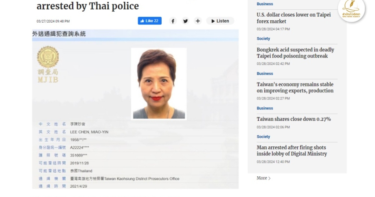 กระทรวงยุติธรรมไต้หวันรายงานเมื่อวันที่ 27 มี.ค.ว่านางหลี่เฉิน เหมียวอิน (Lee Chen Miao-yin) ซึ่งถูกอัยการไต้หวันตั้งข้อหาว่าฝ่าฝืนกฎหมายว่าด้วยการธนาคารถูกคุมขังโดยตำรวจไทยเมื่อวันที่ 26 มี.ค.